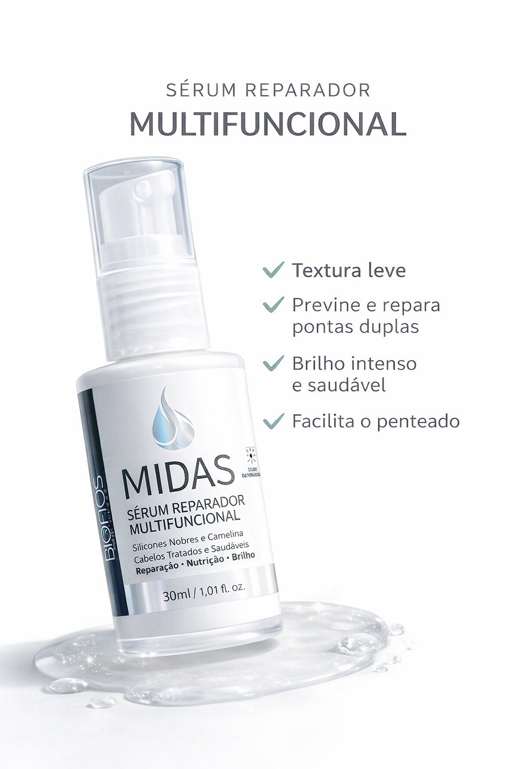 Midas Sérum Reparador de Pontas Protetor Térmico Biofios Profissional 30ml Contém: 01 Midas Sérum Multifuncional para Proteção Térmica 30ml